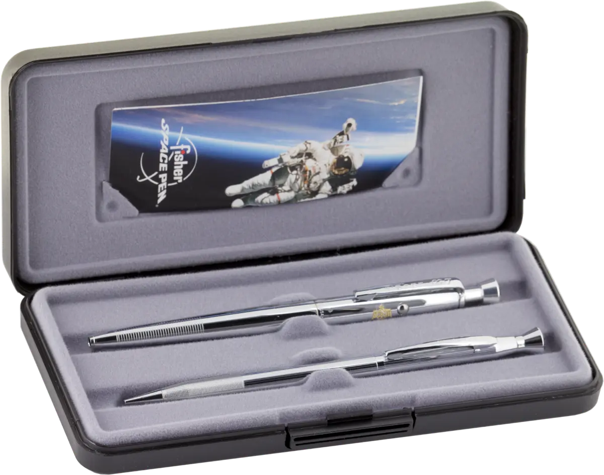 Crafted from solid brass with premium chrome plating, the Fisher Astronaut Aviation Thunderbird Pen & Pencil Set delivers substantial weight that feels reassuring in your hand. Experience the satisfying click mechanism with top plunger and innovative side release button that prevents pocket stains. This T7PPS set combines luxury, functionality and aerospace engineering for writing that's truly out of this world.