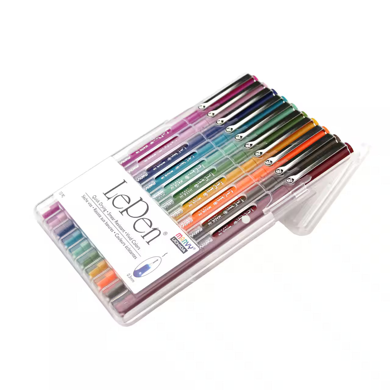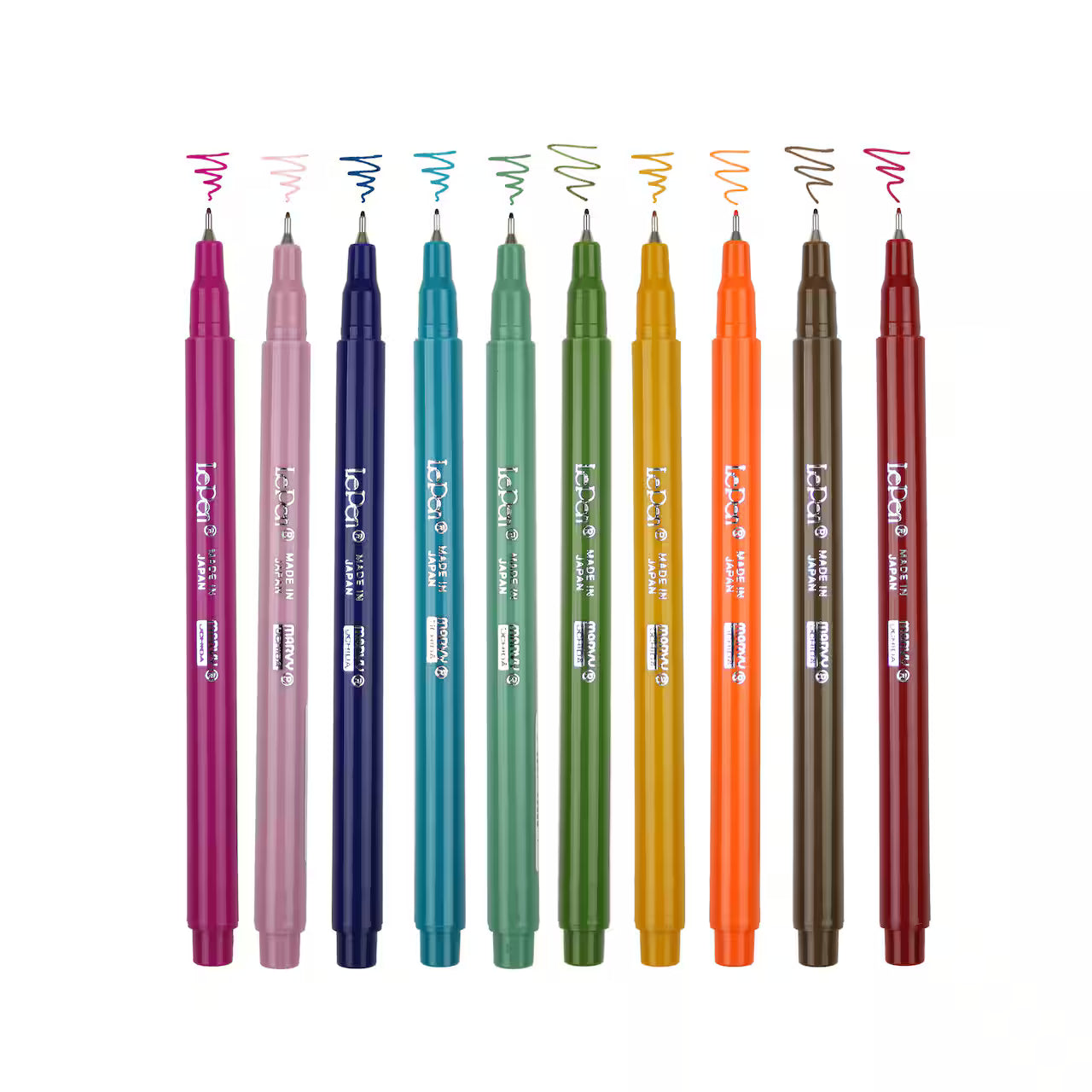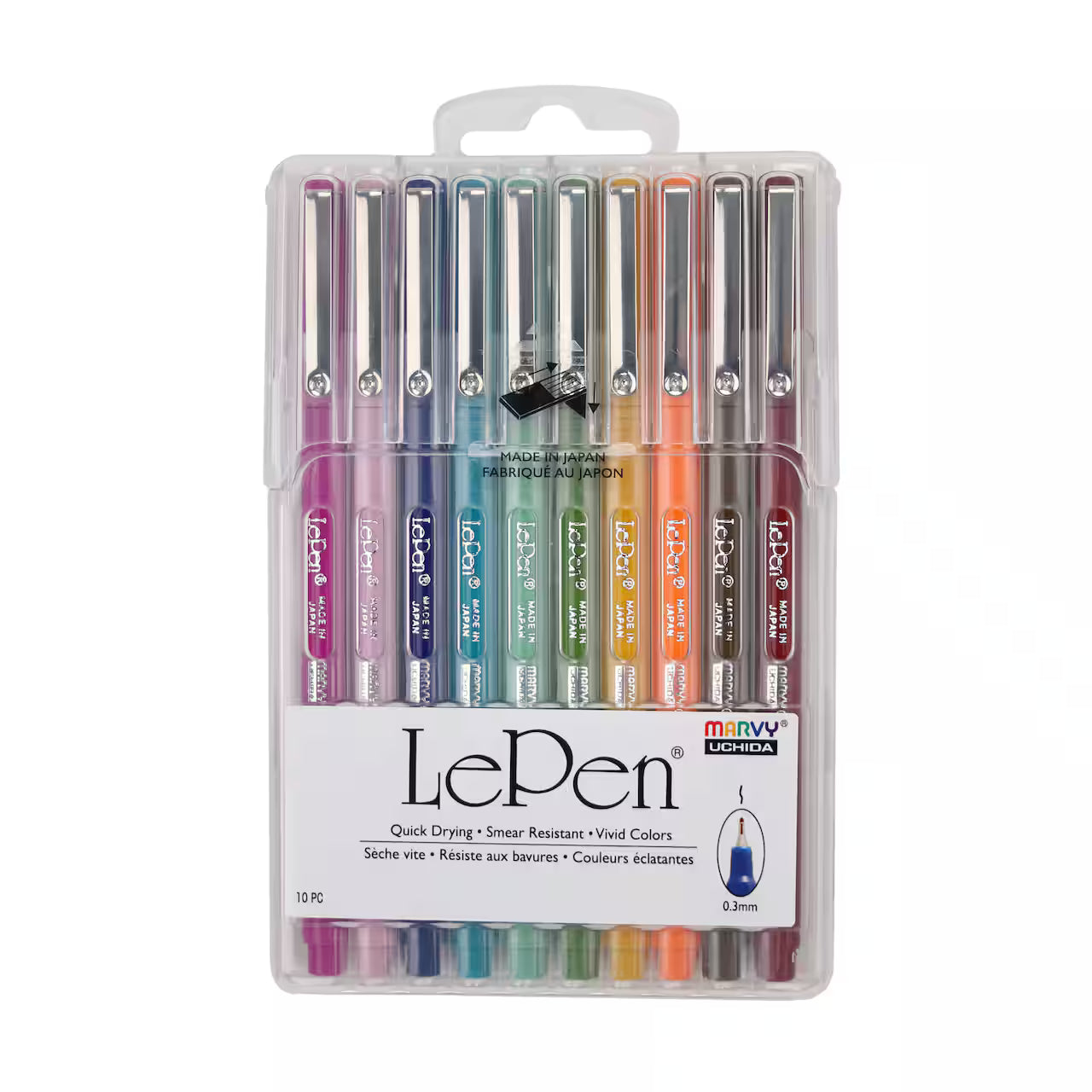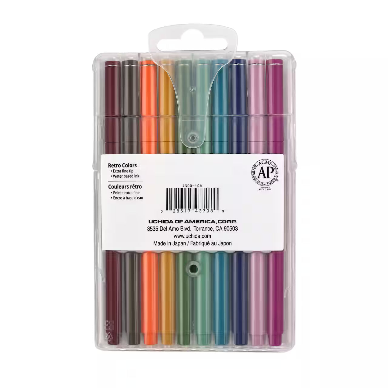The Marvy Le Pen, 0.3mm, 10-piece set comes in neon colors and remains a top favorite. Its smooth, ultra-fine plastic tip ensures precise writing, ideal for bullet journaling, form filling, scrapbooking, academic planners, or letters. The ink is acid-free, non-toxic, smudge-proof, and water-based, with colors that correspond to each barrel, meeting ASTM D-4236 standards. This set includes 10 pens with 0.3mm extra-fine tips in assorted retro shades.