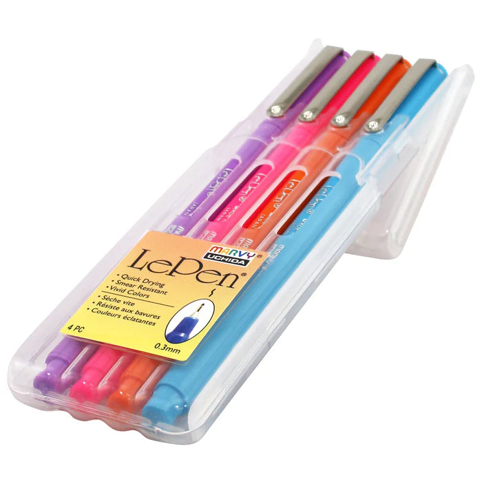 The Marvy Le Pen, 0.3mm, 4-piece set comes in brilliant colors and remains a top favorite. Its smooth, ultra-fine plastic tip ensures precise writing, ideal for bullet journaling, form filling, scrapbooking, academic planners, or letters. The ink is acid-free, non-toxic, smudge-proof, and water-based, with colors that correspond to each barrel, meeting ASTM D-4236 standards. This set includes 4 pens with 0.3mm extra-fine tips in assorted retro shades.