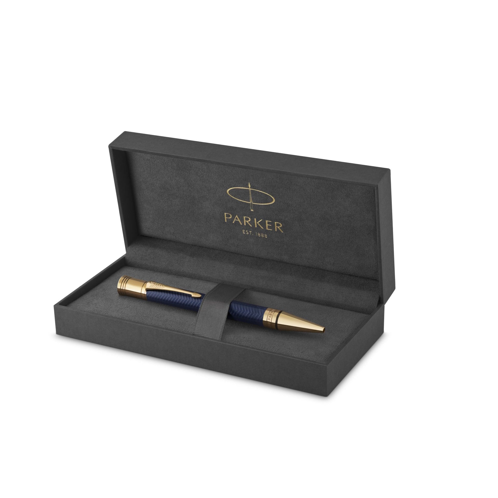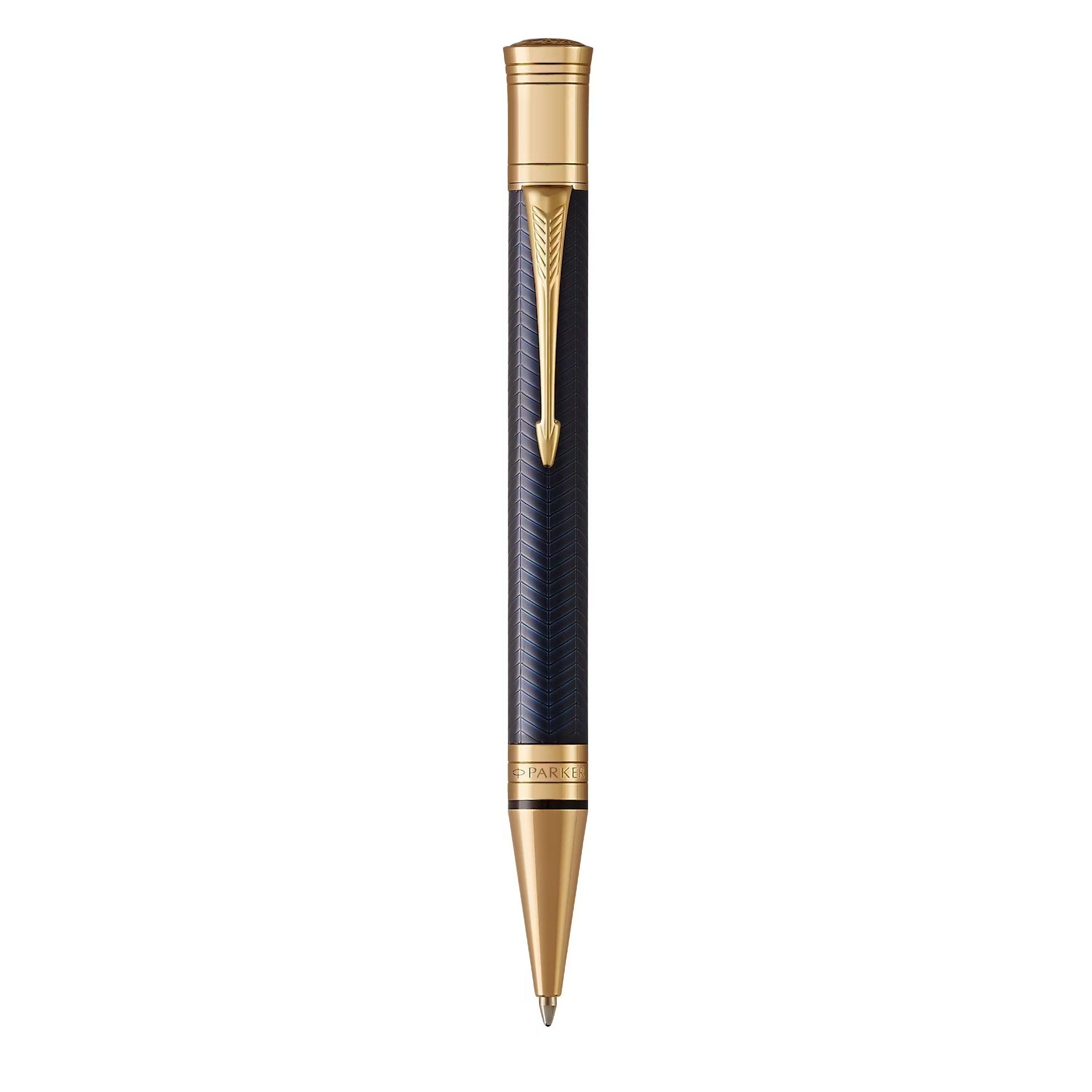 Cultivate exceptional writing moments with the Parker Duofold Prestige Blue Chevron Fine nib fountain pen. This Centennial Size masterpiece upholds Parker's distinguished tradition since 1922, presenting a magnanimous silhouette for superior handling. The opulent velvet black precious resin body is enhanced with tasteful 23-carat gold-plated embellishments, while the 18-carat solid gold bi-tonal rhodium-plated nib ensures calligraphy of remarkable sophistication. A premier selection for the cultivated individual who appreciates the artful synthesis between consummate craftsmanship and refined functionality.