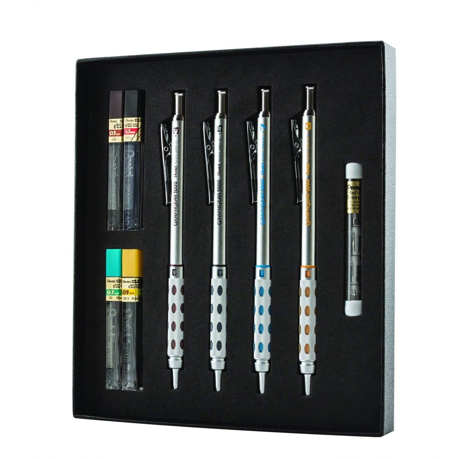 Pentel Arts Graphgear 1000 Premium Automatic Drafting Pencil Set (0.3Mm, 0.5Mm, 0.7Mm, 0.9Mm), 4 Asst. Leads, Refill Erasers, Assorted Gift Box Set